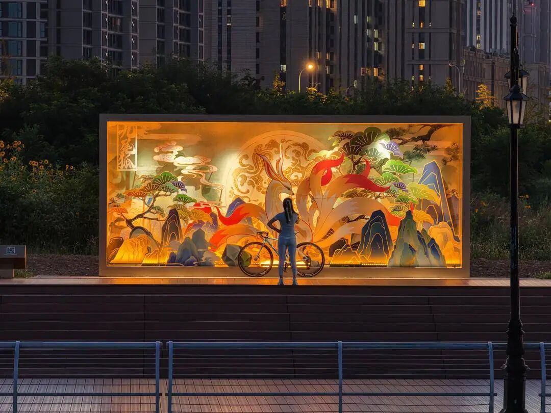 踏入山海經(jīng)文化休閑棧道,一場穿越千年神話的光影奇旅瞬間開啟。約1200米的棧道,宛如一條時光隧道,將《山海經(jīng)》的文化元素巧妙融入。7處大型立體繪本藝術(shù)裝置錯落分布,九尾狐、金烏等靈獸栩栩如生,共工觸山、女媧補(bǔ)天等傳說躍然眼前。白晝時分,陽光灑在裝置上,散發(fā)著神秘氣息;夜幕降臨,光影交織,古老神話仿佛觸手可及。來自鄭州的游客何琦興奮地說:“白天看這些裝置,就覺得特別精美,晚上燈光一亮,感覺真的走進(jìn)了神話世界,太神奇了!”