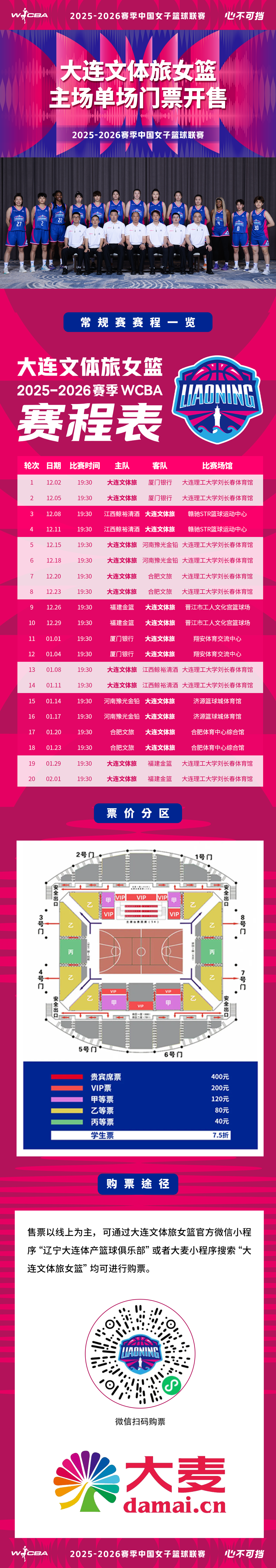 開票公告|2025-2026賽季W(wǎng)CBA聯(lián)賽大連文體旅女籃主場單場門票開售!